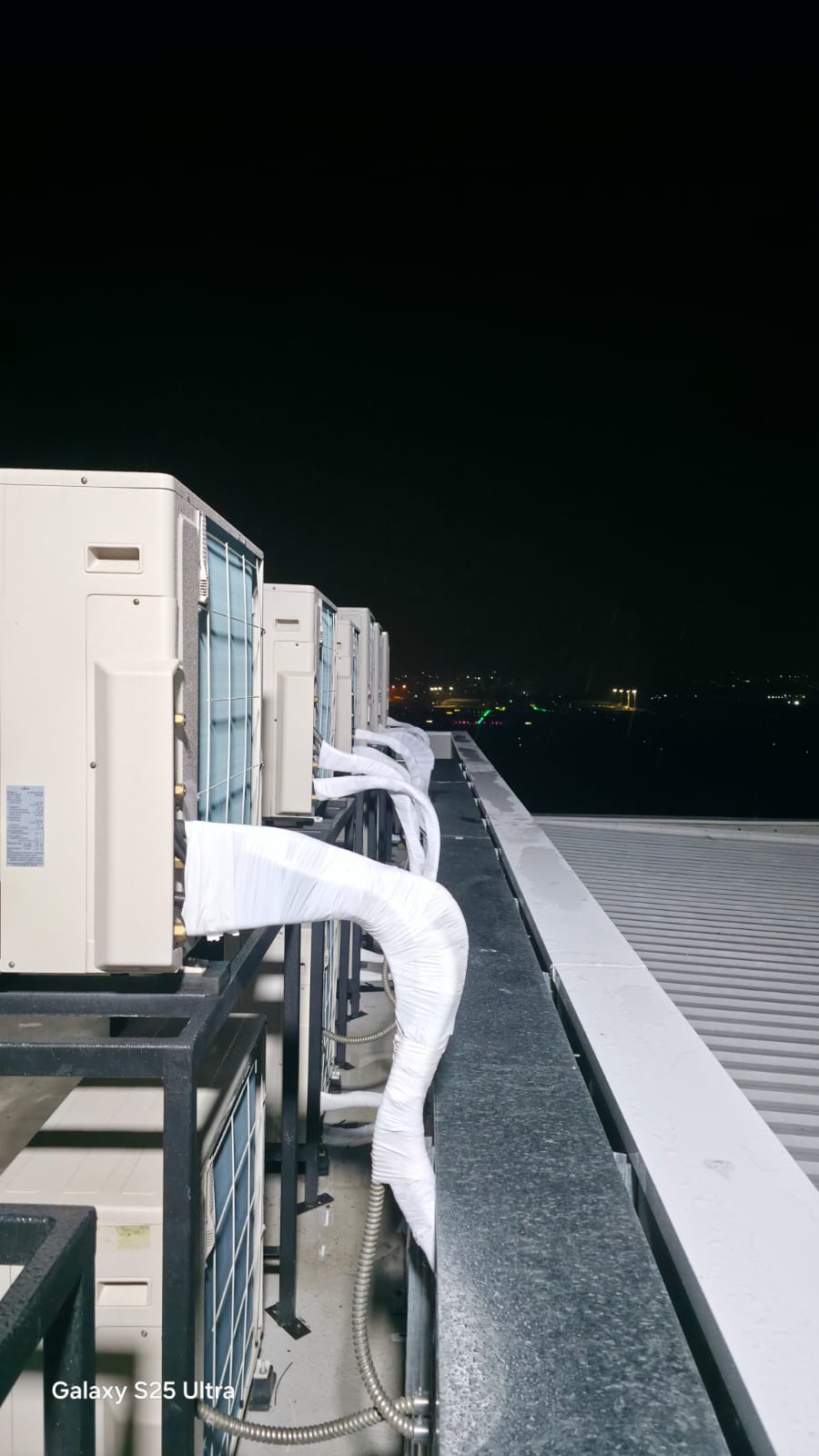 Instalação de sistemas de climatização e rede elétrica de alta demanda. O trabalho inclui a organização de cabos em leitos e eletrocalhas, fixação e direcionamento de tubulações, além da montagem de unidades condensadoras de ar-condicionado. Todo o processo segue normas técnicas de segurança e eficiência energética, assegurando a durabilidade da instalação e a plena capacidade operacional do sistema..
